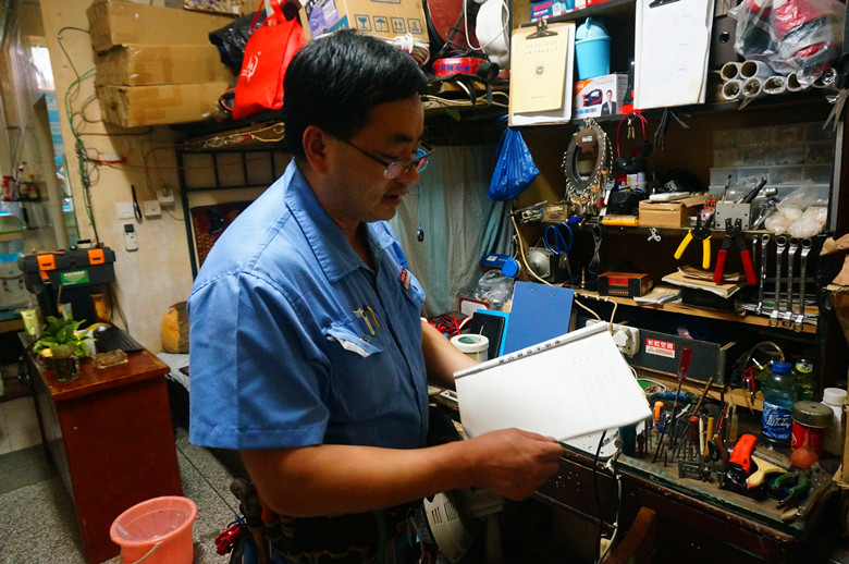 廖明全一个人四年间负责1060多间寝室的日常维护工作,没有周六周日,不分工作时间,随叫随到,每周平均收到上百条维修短信,一公分厚的检修记录册有十几本,检修记录有上万条,而每条维修记录背后,都是廖师傅在各栋宿舍楼,各个楼层之间的奔波。“学生事,无小事,耽误不得!”四年来廖师傅总是随叫随到,做到了“事不过夜”的工作态度。