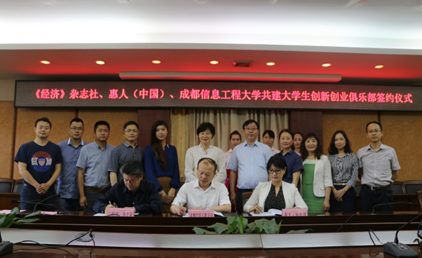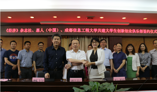 何建新、陈志强、金贞玉分别代表三方现场签订了《“因为有你”成都信息工程大学创新创业实践基地战略合作协议》。