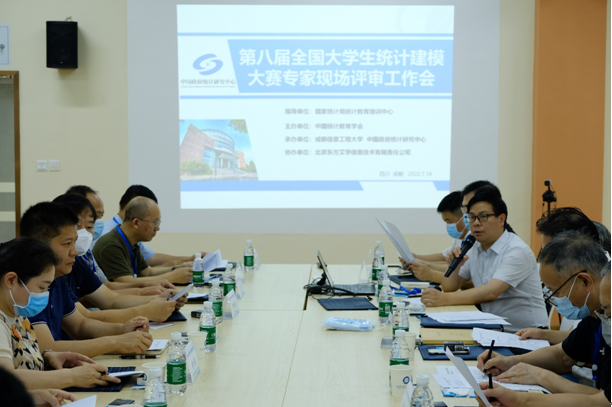 【本网讯】7月16日,由国家统计局统计教育培训中心指导,中国统计教育学会、教育部高等学校统计学类专业教学指导委员会、全国应用统计专业学位研究生教育指导委员会联合主办,成都信息工程大学和中国政府统计研究中心承办的2022年(第八届)全国大学生统计建模大赛现场评审会在我校龙泉校区经管实验中心顺利举行。评审委员会成员及20余位国内“双一流”大学等的统计学界专家、教授参加了此次评审会。国家统计局教育培训中心何继庆处长参加评审会并致辞,我校副校长于世祥、统计学院院领导和部分师生参加了评审会开幕式,开幕式由统计学院院长李勇主持。